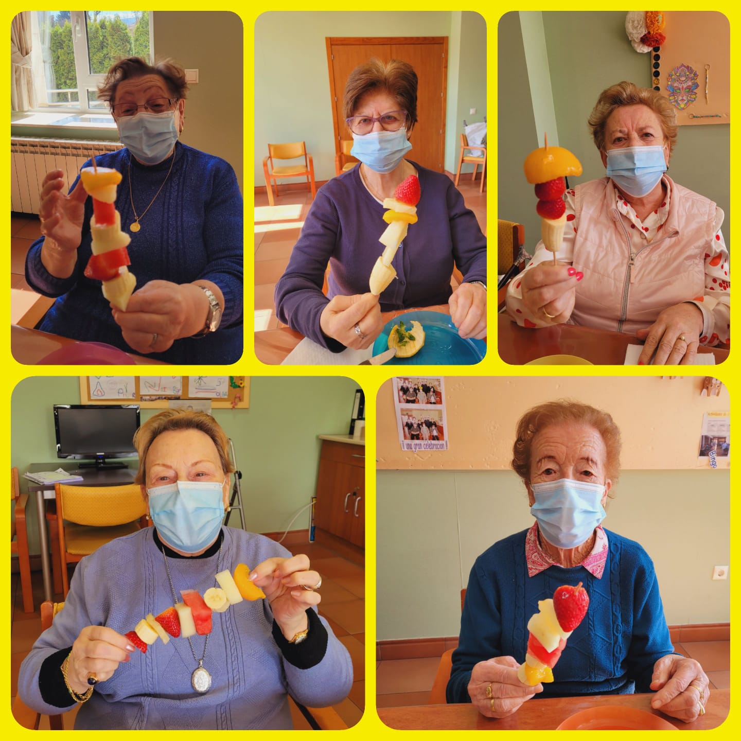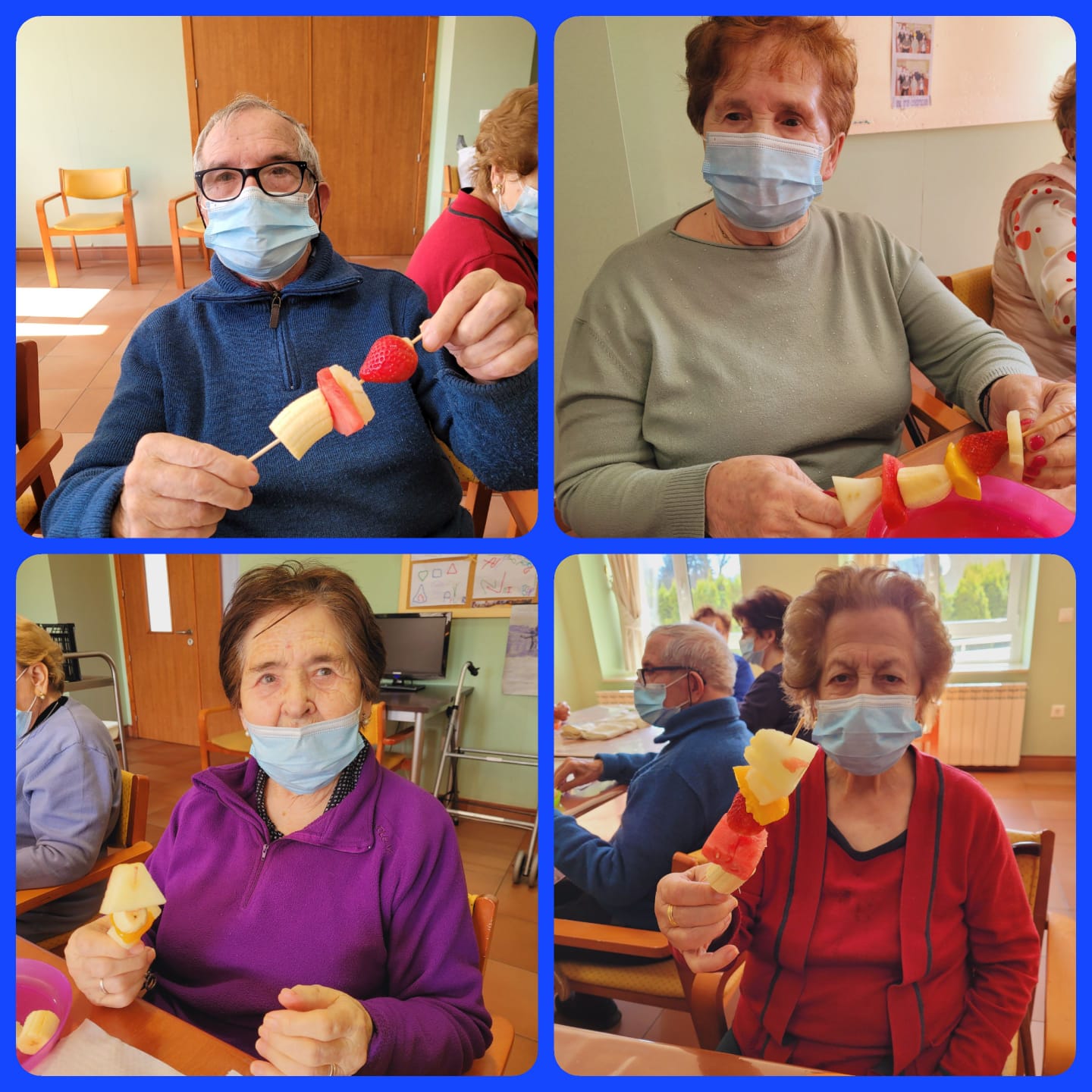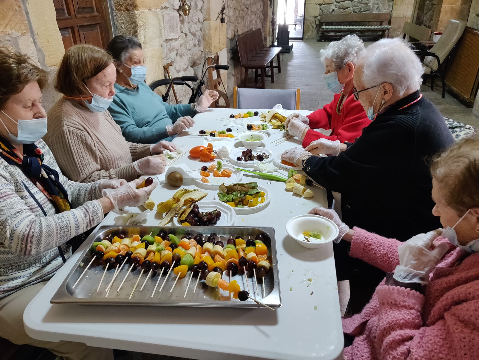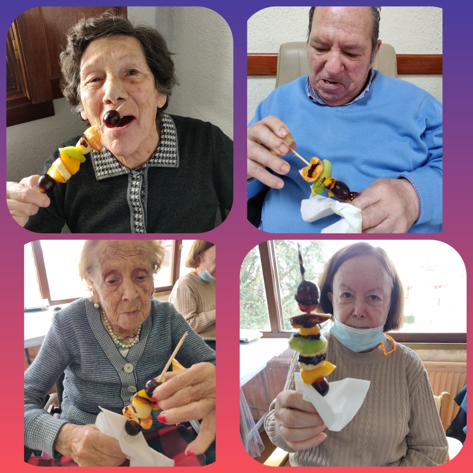 Los usuarios de la Fundación han dado la bienvenida a la primavera a través de una rica merienda, donde ellos mismos han elaborado unas coloridas brochetas de frutas que han disfrutado realizando y posteriormente ofreciendo al resto de compañeros. Esta actividad es significativa para ellos, sobre todo para las mujeres, ya que supone una conexión con sus ocupaciones anteriores al ingreso en el centro.